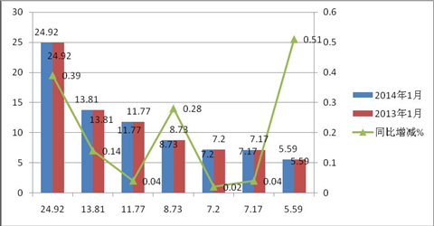 主流客车企业2014年1月在江苏、河南、山东、广东、福建等五大主流区域座位客车市场份额与去年同期比较表(%)