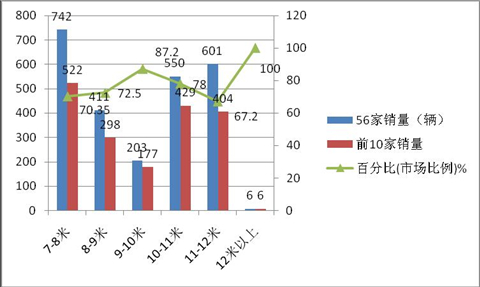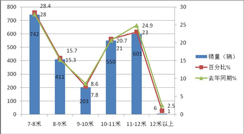 同比各长度车型的销量权重变化情况是:11-12米降幅最大,7-8米及8-9米中型客车权重增加最大。经过市场调研得知,主要是因为高铁和动车的挤压使得大型公路客车客源受到影响;而中型客车的增加主要是因为城乡公交客车的增加所致。