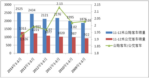 从上图表可知:近6年第一季度:11-12米公路客车与公交车的销量比例均在2.0左右振荡,比例最大的是2011年为2.13,最小的是2014年为1.926。