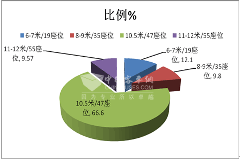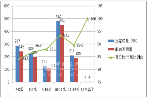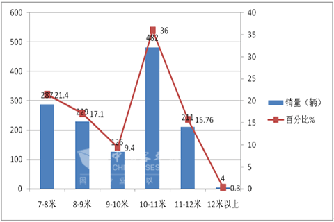 特点一,10-11米车型是主打市场。根据国家车管部门客车上牌数据统计,笔者对天津地区7米以上的客车市场进行了研究。2014年1-4月共有26个品牌的产品在该区域市场发生了销售,在该区域7米以上客车共计销售1339辆,同比2013年的1418辆下降了5.57%。按长度段划分如下: