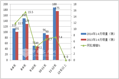 二、四川市场1-4月旅游客车销售数据分析-11-12米销量最大,8-9米次之。再次是6-8米,旅游客车有中型化趋势