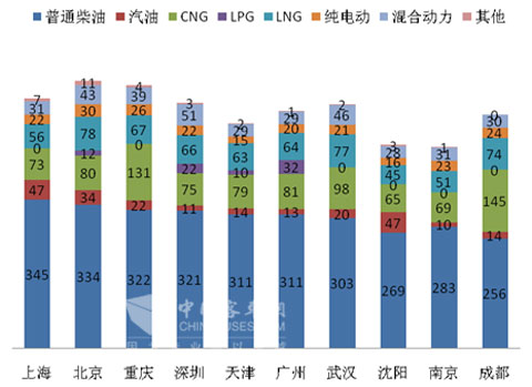 2、在十大城市中,传统柴油燃料仍然是11-12米公交的主要配置,大约占据了50%左右的比例;CNG是11-12米公交在新能源客车中最为成熟的产品,混合动力其次,纯电动客车销量仍然较小,LPG和LNG等清洁燃料作为CNG的补充,目前销量也不大,但在深圳和广州等区域有发展的趋势,并逐步成熟。
