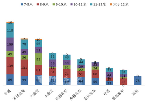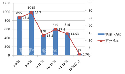 4、8-9米公路客车销量最大,11-12米公路客车销量最小。