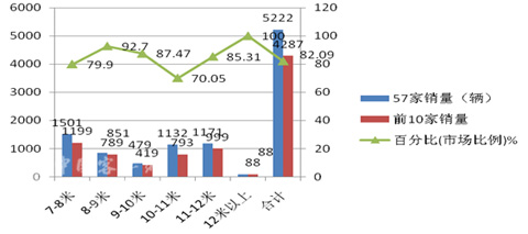 根据国家车管部门上牌统计可以看出,2014年前6月在广东大中型客车市场发生销售的有57个客车制造企业,也就是说有57个竞争品牌瓜分了5222辆的大中型客车的销量,竞争程度是非常激烈的。广东是中国的重要交通大省,也是中国华南客车市场的重要引领区域之一.而在这样区域市场不可能是哪一个或几个企业所能垄断的,因此,客车市场的集中度也不可能太高。前10名主要竞争对手按长度段划分销售情况如下:
