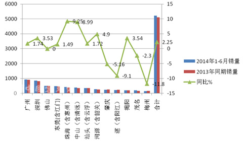 1、广东区域市场是全国市场容量最大的客车市场,也是华南市场的领头羊。2014年1-6月7米以上大中型客车销量是5222辆,比去年同期增加了2.25%,市场增长乏力。