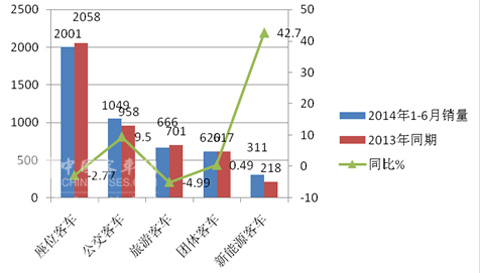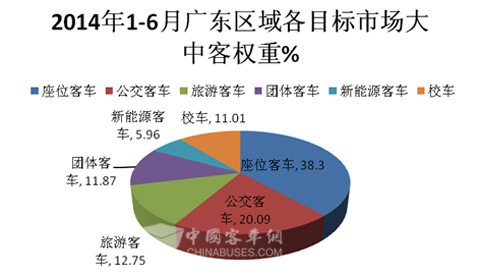1、广东区域2014年前6月座位客车占据的比例最大,同比下降了2.77个百分点;其次销量大的是公交,上升的幅度为9.5%;第三销量大的是旅游客车,同比比例下降了4.99个百分点;第四销量大的是团体客车,同比上升了0.49个百分点;第五是校车,上升的幅度为3.6%,第六是新能源客车,同比增长了42.7%,是所有细分市场中增幅最大的。