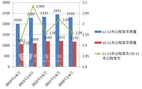 近5年前6月:东北区域11-12米公路客车与10-11米公路客车的销量比例均在2.0左右振荡,比例最大的是2013年为2.083,最小的是2014年为1.912。