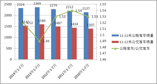1、2014年1-7月西北五大省会城市11-12米公路客车的市场份额均比上年提高。