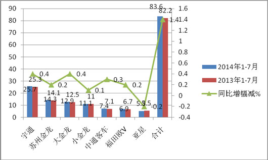 2014年1-7月三龙二通、福田、亚星等主流公路客车企业的11-12米公路客车总量占据五大区域市场的集中度为83.6%,而去年同期其集中度为82.2%,今年1-7月集中度同比上升了1.4个百分点,一方面说明三龙二通等主流公路客车企业是上述五大区域11-12米公路客车的绝对垄断者,同时其垄断地位还在加强,主要原因大致是: