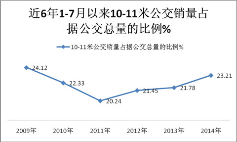 根据近6年1-7月的上牌数据统计计算,近6年1-7月10-11米公交占据公交总量的比例大致如下: