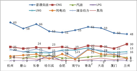 2、在二线十大城市中,传统柴油燃料仍然是10-11米公交的主要配置,CNG是10-11米公交在新能源客车中最为成熟的产品,混合动力其次,纯电动客车销量仍然较小,LPG和LNG等清洁燃料作为CNG的补充,目前销量也不大,但在哈尔滨等区域有发展的趋势。