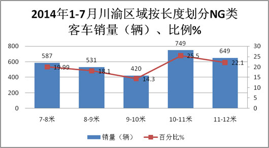 二、2014年1-7月川渝区域NG类客车市场销量数据分析--大型客车中,10-11米比例最高,中型客车中7-8米销量最大。