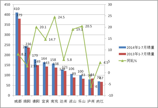 1、四川区域主要10个地市中2014年1-7月的大中NG类客车销量为1637辆,同比增长9.94%。