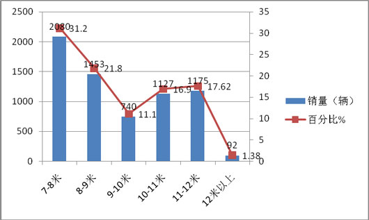 特点一、7-9米中型客车是主打产品,7-8米是销量最大的长度段,其次是8-9米,再次是11-12米