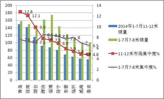 6、11-12米大型客车销量主要集中在青岛、济南、烟台等城市;而7-8米则主要集中在潍坊、淄博、临沂等区域,且11-12米在前10个地市的集中度大于7-8米车型的集中度。