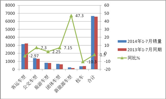 从上图表看出:1、客运是2014年1-7月山东市场大中客市场中最大的细分市场。其次是公交,再次是旅游客车市场,第四是团体客车市场,第五是校车市场,第六是新能源客车市场