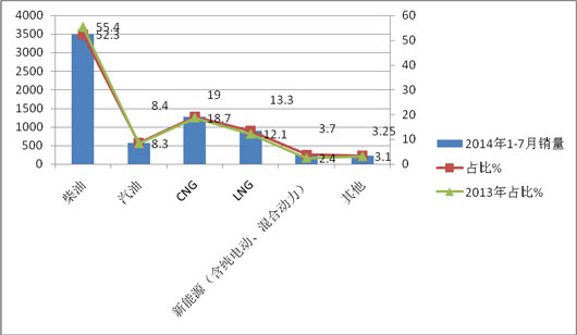 1、柴油仍然是山东2014年1-7月度大中客销量结构中最大的主体动力源,但同比市场比例有所下降(下降了3.1个百分点)。
