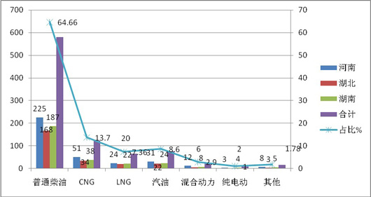 按动力种类划分,在2014年1-10月华中地区三大区域市场9-10米公交销量结构中,普通柴油依然是主体部分,占据的比例为64.66%;NG类占据了第二的比例为21.06%(其中天然气CNG占据了13.7%的比例;LNG占据了7.36%的比例);汽油占据第三大比例为8.6%;混合动力第四为2.9%。华中地区的三大区域市场中,9-10米公交车型中,纯电动客车都已经进入各自市场,但数量普遍在10辆以下,相对9-10米公交的整体销量来说,仍然处于弱小阶段。这主要与纯电动客车市场刚起步,成本过高,很多充电桩等基础设施不完善致使纯电动客车规模化还没有形成等有关。