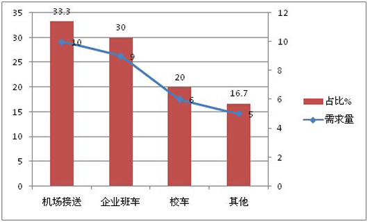 2、对济南租赁公司的调研:山东舜发汽车服务有限公司徐总经理表示对6~8米的客车需求量少,一般都要30~40座以上的客车,多用于给企业做班车、政府机关或事业单位做接待用车、济南西站跑机场等。目前公司并没有纯电动汽车,徐总希望的营销模式是与客车公司做按揭。