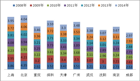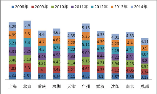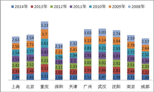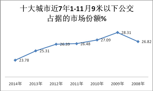公交车是6米以上客车市场中的第二大细分市场,约占6米以上客车总销量的26-30%,城市交通营运的主要工具和载体。而北京、上海、广州、深圳、重庆、天津、武汉、南京、沈阳、成都等十大主流城市又是全国城市公交市场的主要代表,具有鲜明的市场特点。因此,研究2014年1-11月及近6年来同期十大主流城市公交市场的特点,对引导公交客车企业下一步的市场定位和销售导向具有十分重要的参考意义(以下数据均为查阅近7年上牌数据计算所得)。