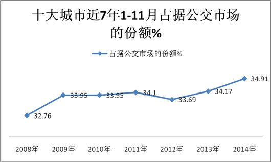 特点一、近7年1-11月10大城市的公交市场份额分析----每年的市场集中度均超过三成,且呈现逐年上升态势(2009年和2010年持平)