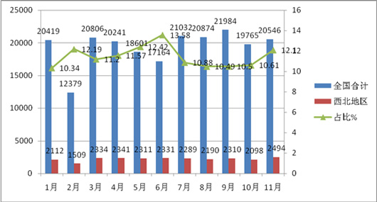 根据国家车管部门上牌数据显示,2014年1-11月,全国轻客销量近213811辆,其中西北五省销量为24319辆,占全国11.37%的市场份额,具体每月销量及占比如下: