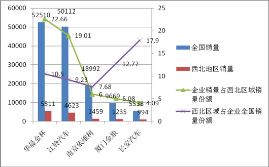 二、2014年1-11月前5名轻客销量企业在西北区域销售情况分析