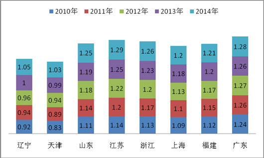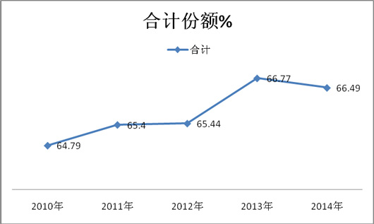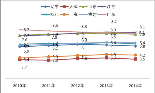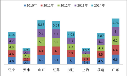 2、近5年中,在前4年沿海8大主流区域中,天津、山东、江苏、上海、福建区域的市场份额是逐年上升的(值得注意的是,广东市场在2010年前是最大,但到了2010年后却是逐年下降的,2010年市场份额达到最大值,原因主要是2010年下半年在广州举行了亚运会这一重大体育赛事,有力拉动了当年广东大型公路客车的销量,直接导致了该区域大型公路客车市场份额的攀升),但到了2014年,各区域市场份额出现拐点。