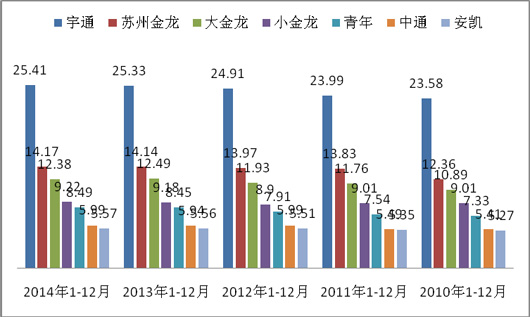 根据上牌数据查阅计算,主流客车企业2014年1-12月及近5年在沿海八大主流区域大型公路客车市场份额与比较表(%)