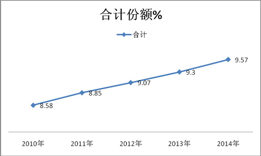 1、沿海8大区域近5年的大型公路市场中的大型旅游车型市场份额在逐年增大,即从2010年的8.58%逐年增大到2014年的9.57%。