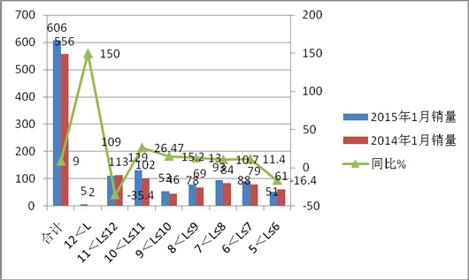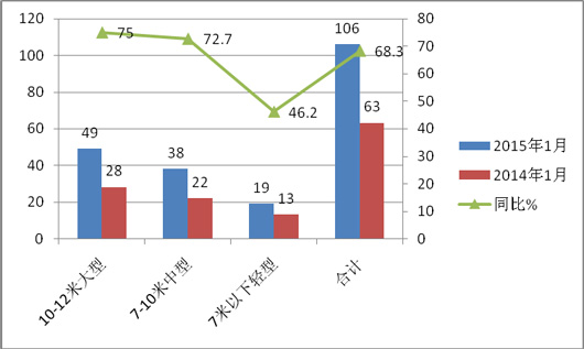1、按长度车型划分,大、中、轻销量在2015年1月同比均呈现正增长,且幅度均超出45%以上。