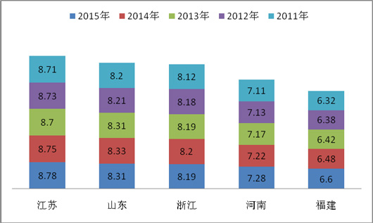 2、从近5年来1月5大主流区域座位客车销量的份额之和看,江苏位居第一,山东位居第二,河南位居第三、福建位居第四,浙江位居第五,市场份额排位基本与该区域的经济状况和人口总量规模大小相匹配。