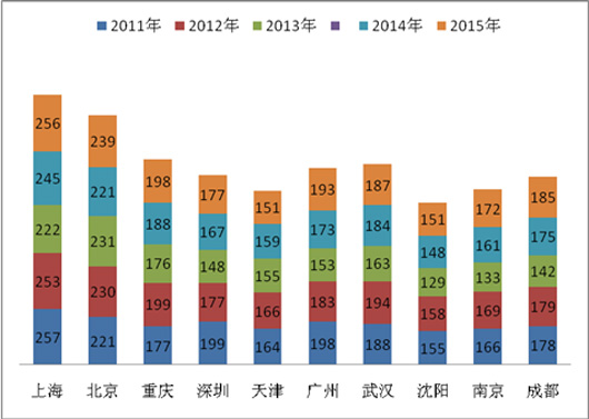 2、近5年来1月,十大城市的10米以上公交产品单辆平均售价逐步提高,产品的安全性、舒适性和环保性能越来越好,上海和北京表现最为突出。