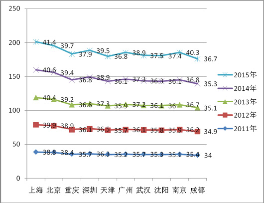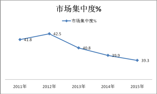 2、近5年来,上海、北京等十大城市的大型公交销量集中度在2012年以前,呈现逐年上升趋势,从2011年的41.8%上升到2012年的42.5%,说明其他区域市场的大型公交车市场份额在逐年下降,但到2012年以后出现拐点,到2012年及2015年一直呈现下降趋势。