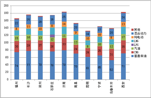 2、在二线十大城市中,传统柴油燃料仍然是10-11米公交的主要配置,几乎占据45%左右的权重,CNG是10-11米公交在新能源客车中最为成熟的产品,几乎占据15%-22%之间的权重;混合动力其次,纯电动客车销量仍然较小,LNG、LPG等清洁燃料作为CNG的补充,目前销量.LPG只在石家庄地区有销售,其他9和城市没有销售。