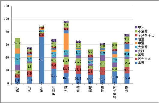 根据市场调研,10-11米公交车是公交市场中次大的细分市场,仅次于11-12米公交市场(11-12米公交占据公交总量的比大约在25%-30%左右),10-11米公交约占公交总销量的比例大约在21%-25%之间,是大中城市主干线路的重点车型,尤其是二线城市的主打公交车型,因此也是各重点区域市场的采购重点车型,对整个公交市场的影响可以说举足轻重,因此研究分析10-11米公交市场尤其是重点二线城市的10-11米公交市场就显得非常重要,下面以2015年1-2月福州、长沙、郑州、石家庄、济南、南昌、昆明、宁波、乌鲁木齐、西安等十大二线城市的10-11米公交市场情况作为对象来分析之。
