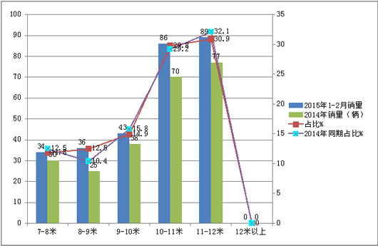 从上图表可以看出:四川市场,2015年1-2月11-12米是主打产品,其次是10-11米,再次是9-10米,也就是说大型客车是四川旅游客车市场的主打产品。同比2014年同期,8-9米和10-11米段旅游客车权重加大,其余则减少,增幅最大的是8-9米段。