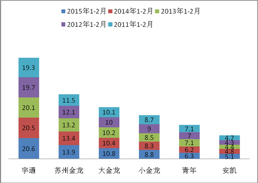根据上牌数据查阅计算,主流客车企业2015年1-2月及近5年在云、贵、川、渝主流区域座位客车市场份额与比较表(%)