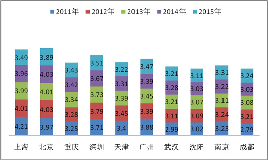 2、近5年来,在上海、北京等十大城市中,除去重庆区域的市场份额是逐年上升的外(从2011年的3.25%逐年升高到2015年的3.43%),其余城市的公交市场份额都是忽高忽低,无一定规律可循.