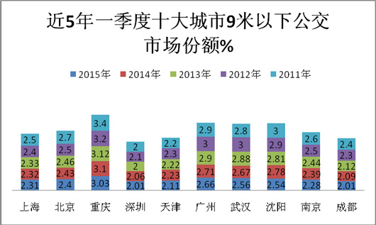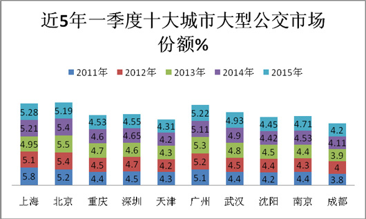 公交车是5米以上客车市场中的第二大细分市场,约占5米以上客车总销量的26-30%,城市交通营运的主要工具和载体。而北京、上海、广州、深圳、重庆、天津、武汉、南京、沈阳、成都等十大主流城市又是全国城市公交市场的主要代表,具有鲜明的市场特点。因此,研究2015年第一季度及近5年来同期十大主流城市公交市场的特点,对引导公交客车企业下一步的市场定位和销售导向具有十分重要的参考意义(以下数据均为查阅近5年上牌数据计算所得)。