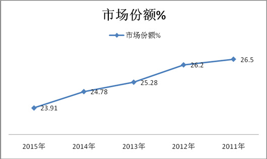 3、上海的市场份额在2011年达到最高,北京的市场份额在2012年和2014年达到最高,广州的市场份额在2011年达到最高。