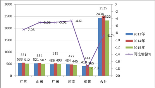 根据最新车管部门统计,截止2015年前3月,江苏、山东、广东、河南、福建五大区域11-12米公路客车销售了2322辆,比去年同期的2525辆下降了约8.74%,比2014年同期的增长幅度缩减了近12.4个百分点,占据了全国11-12米公路客车市场近33.1%的比例(2014年同期占据的比例为32.9%)。