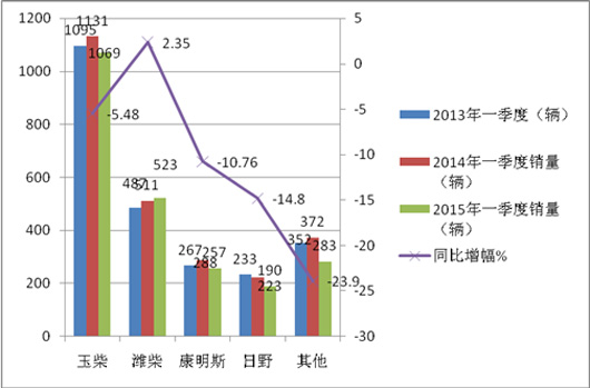 2、特点二:11-12米公路客车的主要配置以国产发动机为主体,国产发动机中,潍柴增幅较大,进口发动机中康明斯增幅较大。根据车管部门信息统计,2015年第一季度11-12米公路客车主要配置用的国产发动机大约占据到65.03%左右,主要是玉柴发动机,其次是潍柴发动机,进口发动机主要以康明斯和日野为主打。