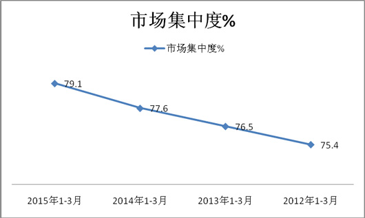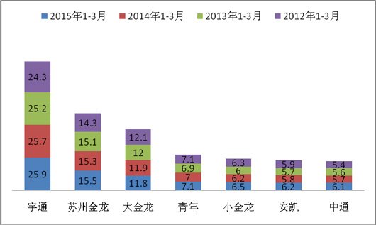 2015年1-3月三龙一通、青年、安凯、中通等主流公路客车企业的11-12米公路客车总量占据五大区域市场的集中度为79.1%,比2014年同期的77.6%提高了近1.5个百分点,比2013年同期的76.5%提高了2.6个百分点。一方面说明三龙二通等主流公路客车企业是上述五大主流区域11-12米公路客车的绝对垄断者,同时其垄断地位还在加强,这也从一定程度上说明了三龙二通等强大的原因。