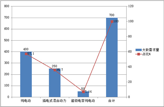 在未来一年需求的近700辆新能源客车需求中,纯电动需求大约在400辆左右,而插电式混合动力可能需求在250辆,超级电容纯电动公交车需求大约在50辆,具体如下表:
