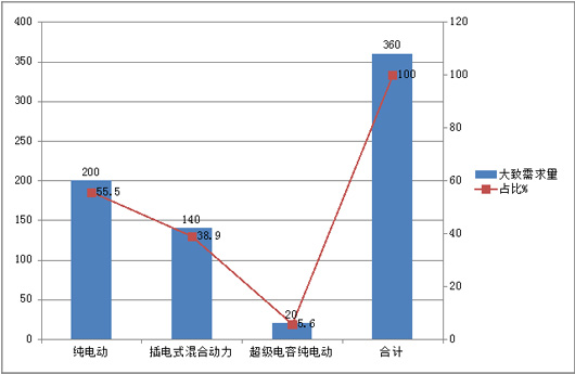 在未来一年需求的近380辆新能源客车需求中,纯电动需求大约在210辆左右,而插电式混合动力可能需求在140辆,超级电容纯电动公交车需求大约在30辆,具体如下表: