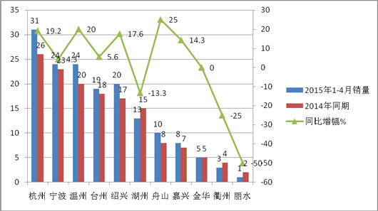 2、与2015年1-4月相比,浙江省的高档客车销量提高了8.97%,,但具体到各个地市,情况又不一样:即:湖州下降了13.3%,衢州下降25%,丽水下降50%,在11个地市中下降最大,但由于基数不大,不能说明什么问题。而嘉兴、台州等地区则保持相对稳定。衢州、丽水等相对欠发达地区,高端客车本身的市场需求量就不大,降幅较大是因为基数较小所致,更不能说明高端客车在该区域是大幅度下降。杭州销量最大,舟山升幅最大。