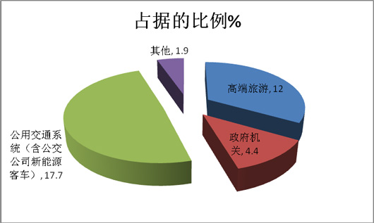按目标市场用途划分,高速客运公司高端客车销量占据了63.9%,比2014年同期的74.5%的市场份额降低了10.6%,是浙江区域高端客车的最大用户。其次是高端旅游市场占比为12%,与2014年同期基本持平;再次是政府机关公务用车占比为4.4%,同比降低1.8个百分点;第四是公交系统新能源客车占比为17.7%,比2014年同期提高了近13.6个百分点,也是浙江高档客车市场中提高幅度最大的细分市场;高速客运市场虽然占据份额最大,但同比呈现下降趋势,根据调研湖州高速客运公司机务处王处长等业内专家,得知主要是因为浙江区域去年通了很多条高铁线路(如杭州—湖州、杭州—合肥、宁波—南京等),对浙江区域的高速客运市场有一定的冲击。