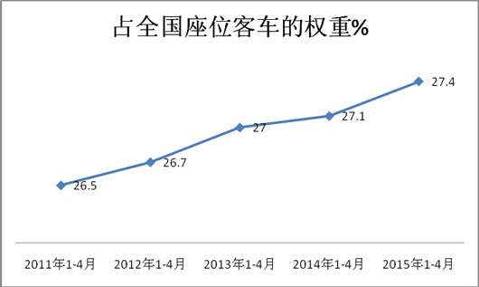 1、近5年1-4月华东五区域座位客车的销量在前2年是增长的,但到了2013年1-4月后却逐年下降。且延续到2015年1-4月仍然下降,但占据全国座位客车的市场权重却一直呈现上升态势,即从2011年的26.5%一路上升到2015年1-4月的27.4%。