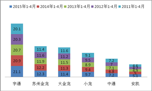 2015年1-4月鲁、苏、浙、沪、皖等华东五区域座位客车市场特点浅析